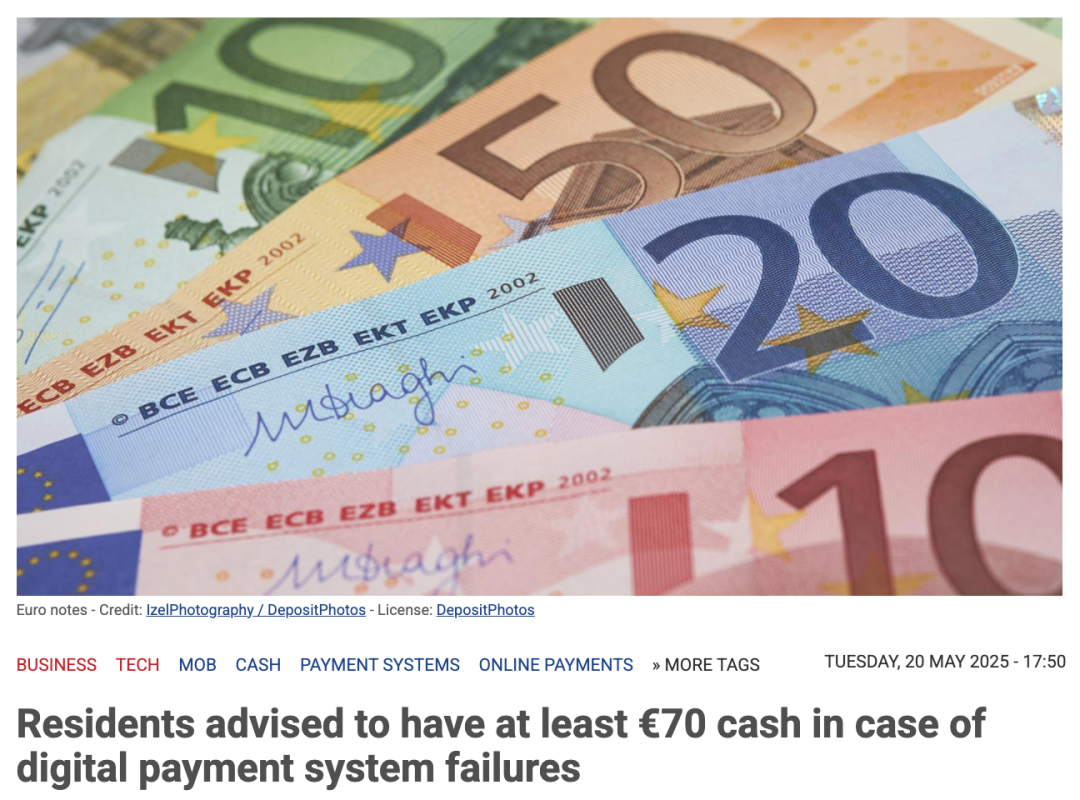 所有人都应在家中准备一笔应急现金:成人€70,儿童€30,以应对突发情况,比如电子支付系统大规模瘫痪