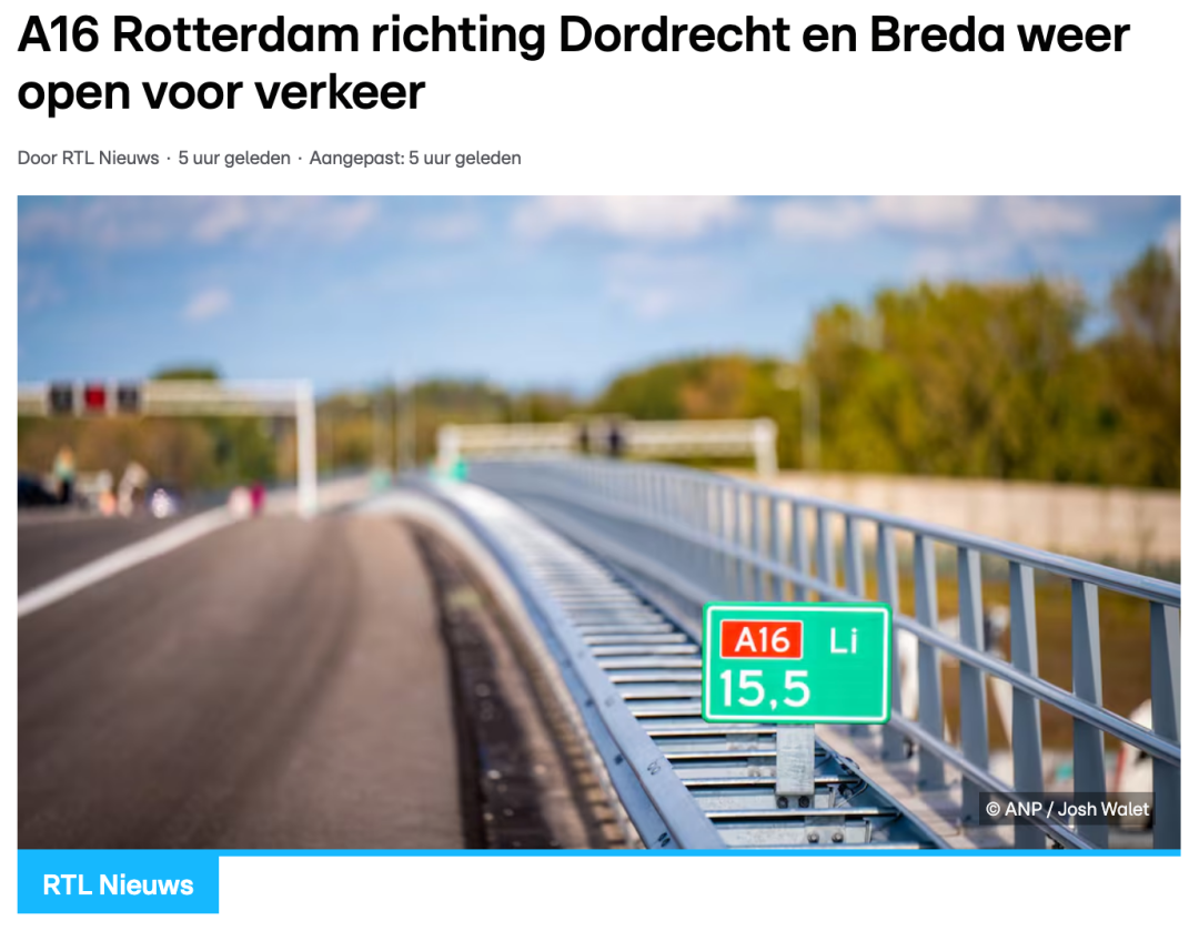 据rtl.nl报道,今晨5点,全新A16高速鹿特丹段正式开放通行。这条新建连接线位于鹿特丹北部,全长数公里,是荷兰近年来最大型的基础设施项目之一。