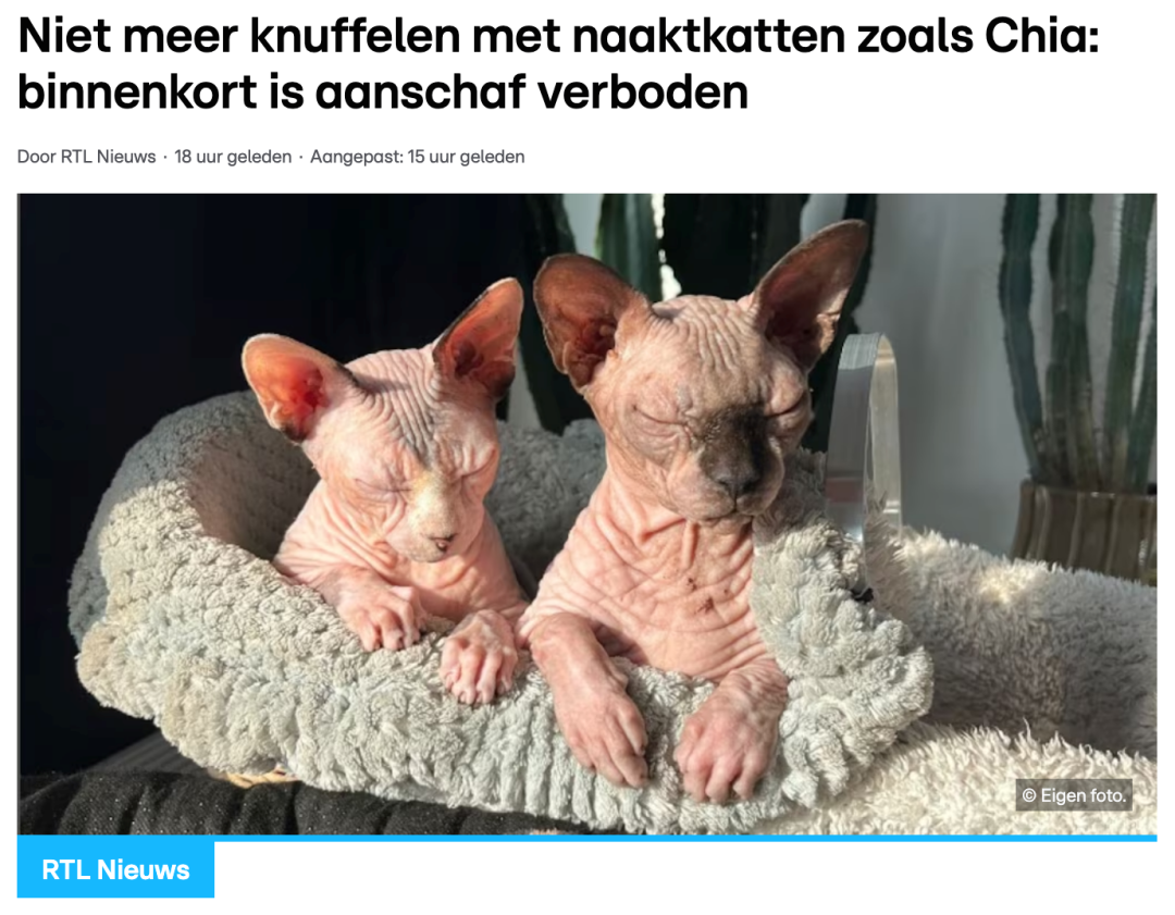 据rtl.nl报道,荷兰国家秘书Jean Rummenie宣布,自2026年1月1日起,禁止饲养无毛猫和折耳猫。这些猫自2019年起已经被禁止繁育。官方表示,这一规定的目的是避免这些猫因外貌特征而遭受不必要的痛苦