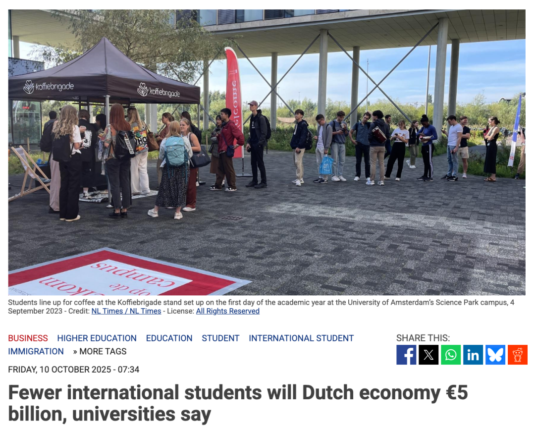 据nltimes.nl报道,根据莱顿大学、乌特勒支大学、阿姆斯特丹大学、阿姆斯特丹自由大学和鹿特丹伊拉斯谟大学联合委托的研究,减少国际学生将使荷兰GDP下降约€40亿至€50亿。