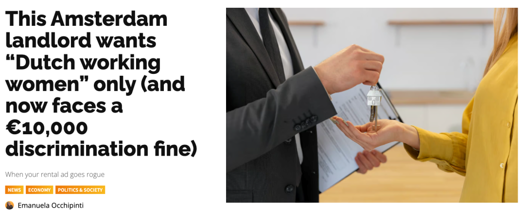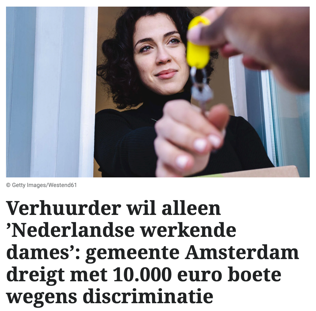 据telegraaf.nl报道,在阿姆斯特丹,一名男性租客因被拒租而提出举报,理由是房东只愿将房屋出租给“荷兰籍工作女性”。