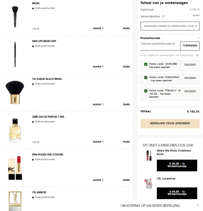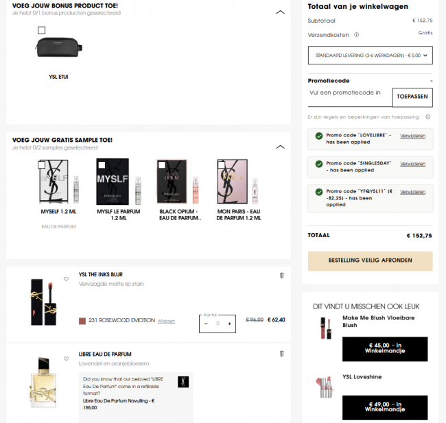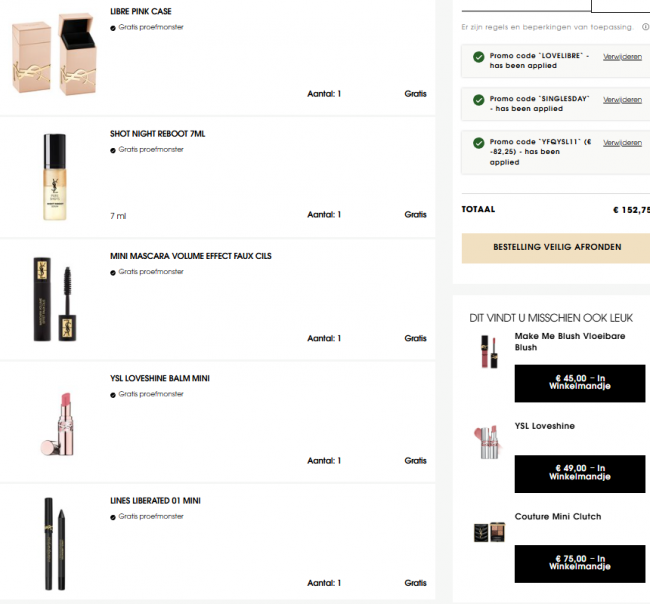 2.输入独家折扣码:YFQYSL11,折后满70€赠3件码:SINGLESDAY,买自由之水系列送香水盒子码:LOVELIBRE